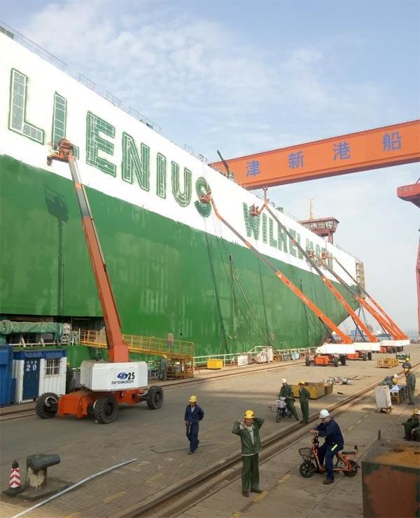 星邦智能的高空作業(yè)車在船塢內(nèi)對船體施工(供圖:肖偉)