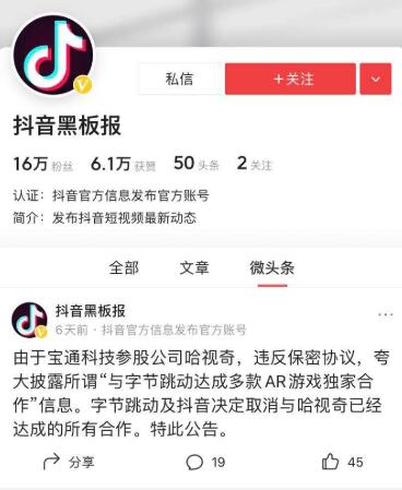 值得注意的是,寶通科技公眾號文章提到了“哈視奇更是與字節(jié)跳動(dòng)(抖音)達(dá)成獨(dú)家代理合作,為抖音獨(dú)家定制AR游戲,并且有多款游戲正在洽談中。”