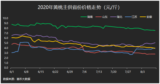 由惠農網大數據生成的全國主要黃桃產地價格走勢圖(供圖:惠農網)