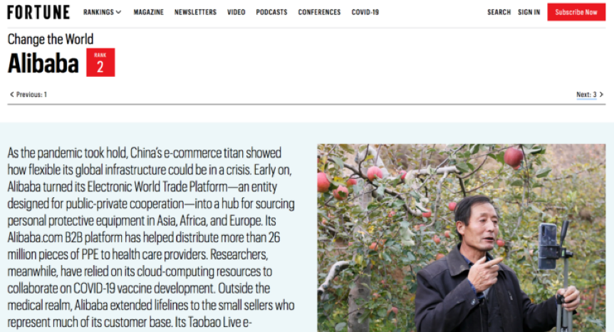在美國(guó)《財(cái)富》雜志近日發(fā)布的“2020改變世界的企業(yè)”榜單中,阿里巴巴集團(tuán)(下稱“阿里”)第六次上榜,并首度位列榜單第二。榜單稱,阿里在疫情期間展示了其全球基礎(chǔ)設(shè)施在危機(jī)中的靈活性,特別是淘寶直播平臺(tái)在農(nóng)村供應(yīng)鏈?zhǔn)芤咔樽钄嗪?,幫助農(nóng)戶開拓了新用戶。