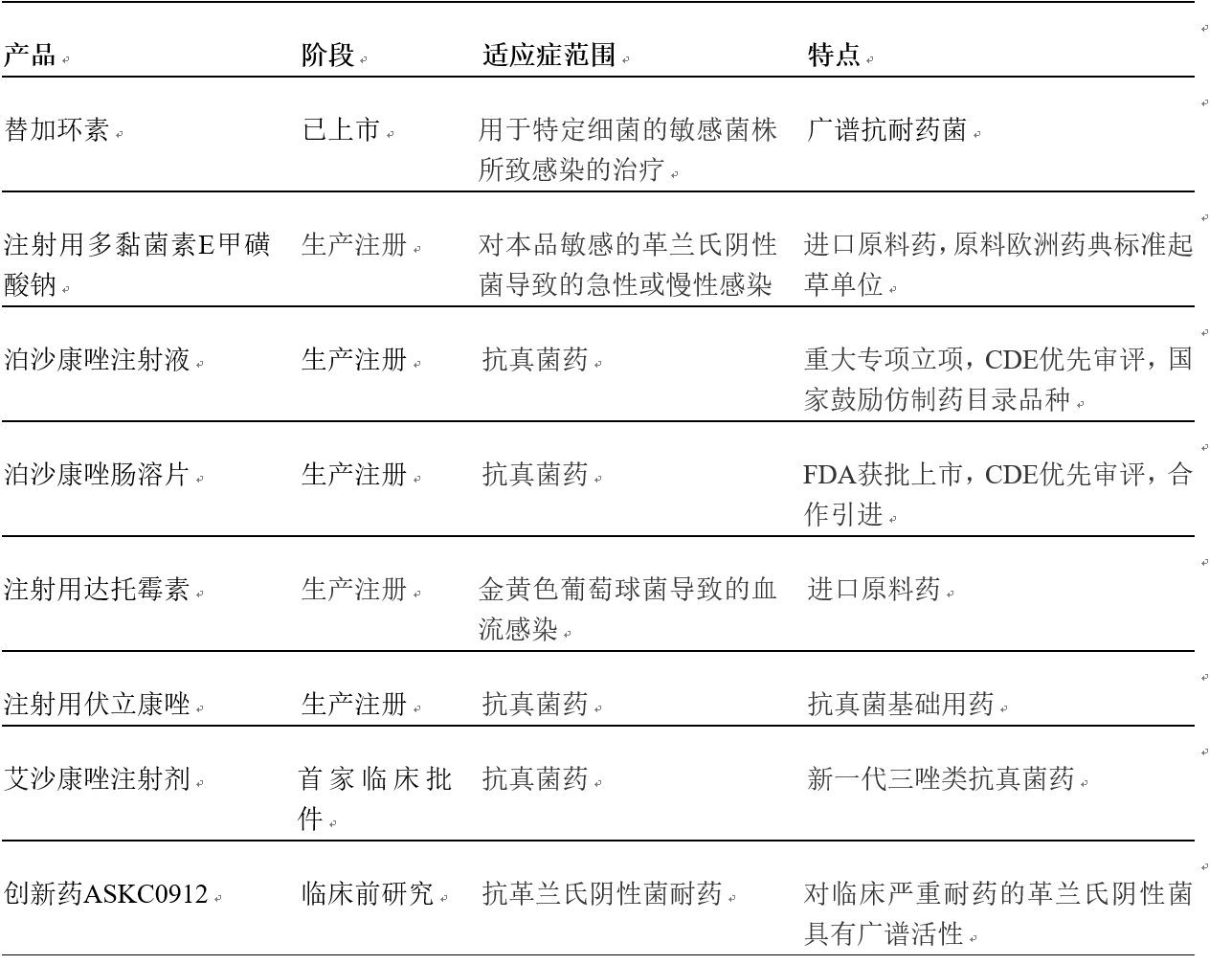 與此同時,奧賽康積極優(yōu)化產(chǎn)業(yè)結(jié)構(gòu),在抗耐藥菌感染和慢性病領(lǐng)域均有建樹。公司從臨床需求的角度出發(fā),現(xiàn)已形成不同梯度、針對不同耐藥菌感染的系列產(chǎn)品線布局(詳見下表),將進(jìn)一步鞏固公司在耐藥菌感染領(lǐng)域的地位,產(chǎn)生新的經(jīng)濟(jì)增長點(diǎn)。