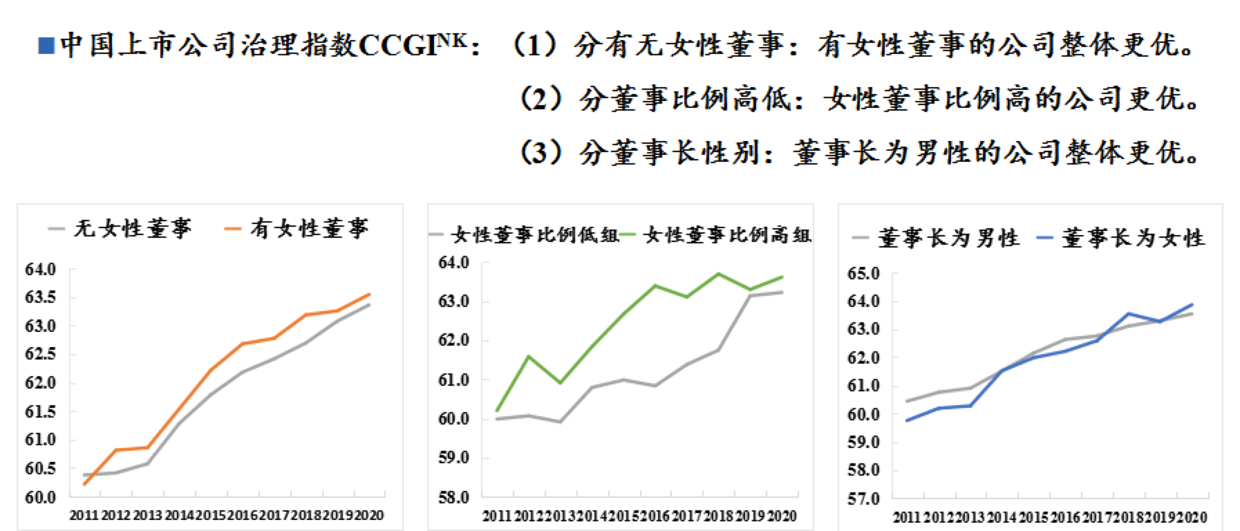 實際上,據(jù)前述《報告》,雖然在過去十年間女性董監(jiān)高的數(shù)量正不斷增加,目前,女性董事參與上市公司戰(zhàn)略決策的程度仍然較低。數(shù)據(jù)顯示,即便有72.77%的上市公司設(shè)置了女性董事,但其中50%以上的女性董事僅是獨立董事?!秷蟾妗分刑岬?,有觀點認(rèn)為,多元化可以提高董事會的決策水平,改善公司與投資者、外部團(tuán)體及顧客的關(guān)系,甚至直接提高公司的績效等。而從中國上市公司治理指數(shù)來看,有女性董事及女性董事比例高的公司整體表現(xiàn)的確更勝一籌。