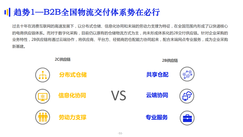 數(shù)字化采購從政府機(jī)構(gòu)、央國企、金融機(jī)構(gòu)的陽光化采購開始起步,當(dāng)前正逐步向大型企業(yè)、地方國企滲透。其中,大型政企客戶對(duì)采購服務(wù)商的全國性交付網(wǎng)絡(luò)和本地服務(wù)體系十分重視。億邦智庫在報(bào)告中提出,數(shù)字化采購市場發(fā)展趨勢(shì)下,B2B全國物流交付體系勢(shì)在必行。行業(yè)中許多領(lǐng)軍型企業(yè)已經(jīng)在布局全國的物流交付體系,這對(duì)整個(gè)數(shù)字化采購市場的繁榮將起到巨大促進(jìn)作用。報(bào)告也指出,數(shù)字化采購將推動(dòng)形成體系化的B2B交付供應(yīng)鏈,并將供應(yīng)商、平臺(tái)方、經(jīng)銷商的倉配能力協(xié)同起來,配合末端網(wǎng)點(diǎn)專業(yè)服務(wù),成為企業(yè)采購的新基建。