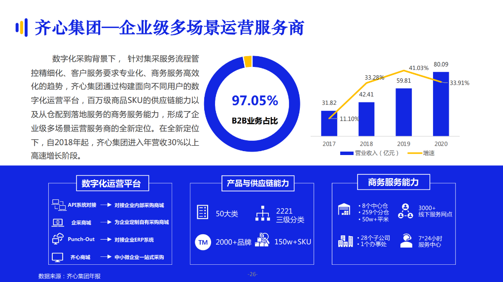 致力于成為“企業(yè)級(jí)多場景運(yùn)營服務(wù)商”的齊心集團(tuán),近年迎來高速增長階段。對(duì)比同行業(yè)企業(yè),齊心集團(tuán)在數(shù)字化運(yùn)營平臺(tái)、產(chǎn)品與供應(yīng)鏈能力、商務(wù)服務(wù)能力三方面樹立了較強(qiáng)的競爭優(yōu)勢(shì),在辦公集采領(lǐng)域持續(xù)開拓政企大客戶,新增黨政機(jī)關(guān)、航空航天、能源電力、工程建筑、金融通訊等行業(yè)大客戶,并深挖原有客戶業(yè)務(wù)訂單需求。同時(shí),齊心集團(tuán)也在MRO工業(yè)品、企業(yè)福利品業(yè)務(wù)方面持續(xù)深耕強(qiáng)化品類優(yōu)勢(shì),為B2B業(yè)務(wù)打造新的增長極。據(jù)齊心集團(tuán)年報(bào)顯示,自2018年起,其年?duì)I收保持增長30%以上。
