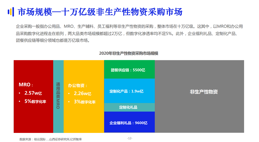 5月26日,專注于電子商務(wù)產(chǎn)業(yè)研究的億邦智庫正式發(fā)布了《2021中國數(shù)字化采購發(fā)展報(bào)告》(以下簡稱“報(bào)告”)。報(bào)告顯示,2021年數(shù)字化采購市場正式進(jìn)入成長期,其中以MRO工業(yè)品和辦公用品采購數(shù)字化進(jìn)程走在前列,兩大品類市場規(guī)模都超過2萬億。報(bào)告預(yù)測(cè),在十萬億級(jí)、數(shù)字化滲透率不足5%的采購市場內(nèi),將有希望誕生一批營收過千億、市值過千億的雙千億平臺(tái)。