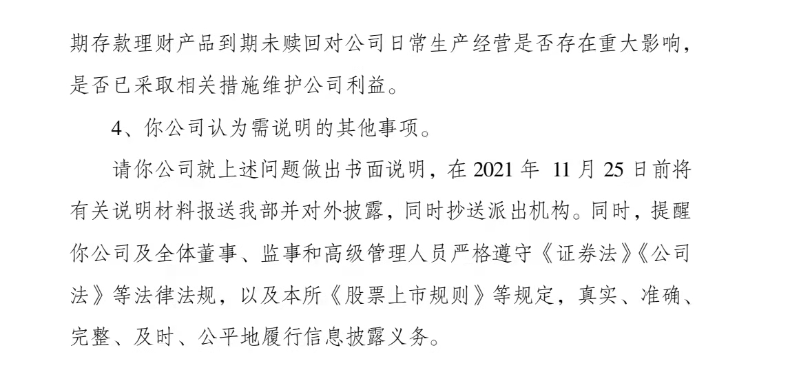 同時(shí),深交所要求公司年審會(huì)計(jì)師結(jié)合公司2020年底銀行存款詢證函回函情況,補(bǔ)充說明相關(guān)審計(jì)程序是否充分,所獲審計(jì)證據(jù)是否準(zhǔn)確,公司2020年年報(bào)關(guān)于銀行存款質(zhì)押狀態(tài)的披露是否存在真實(shí)準(zhǔn)確。并結(jié)合公司2021年三季度末貨幣資金余額,補(bǔ)充說明到期未贖回期存款理財(cái)產(chǎn)品對(duì)公司日常生產(chǎn)經(jīng)營是否存在重大影響,是否已采取相關(guān)措施維護(hù)公司利益。