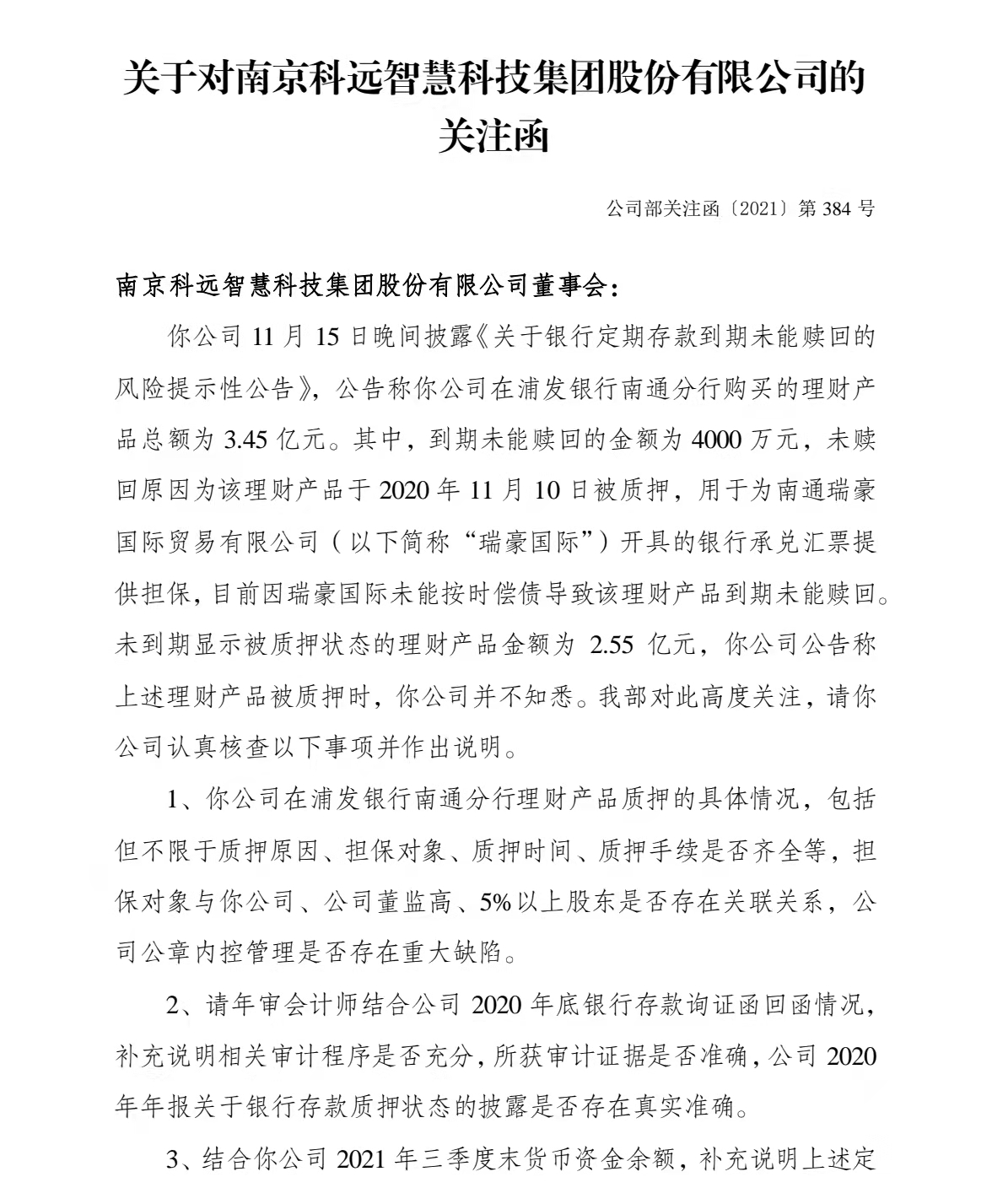 科遠(yuǎn)智慧3億元存款遭質(zhì)押擔(dān)保一事持續(xù)引發(fā)市場關(guān)注,11月17日,深交所向公司下發(fā)關(guān)注函,要求公司認(rèn)真核查并說明在浦發(fā)銀行南通分行理財(cái)產(chǎn)品質(zhì)押的具體情況。