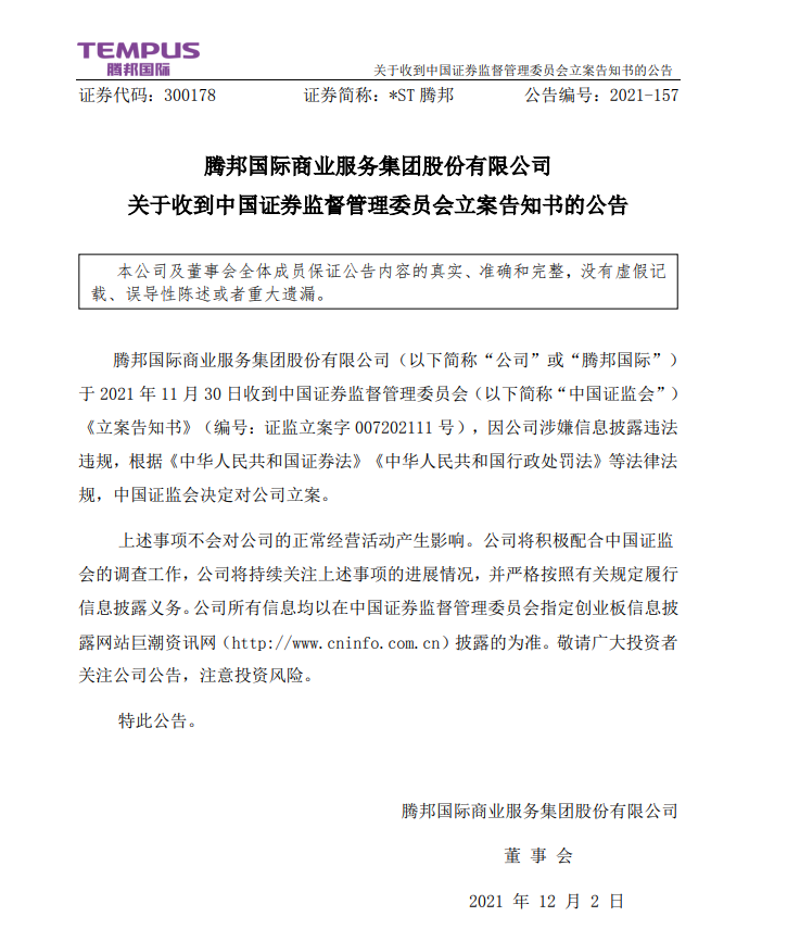12月2日晚間,*ST騰邦發(fā)布公告稱,公司于11月30日收到中國證監(jiān)會《立案告知書》,因涉嫌信息披露違法違規(guī),中國證監(jiān)會決定對公司立案。