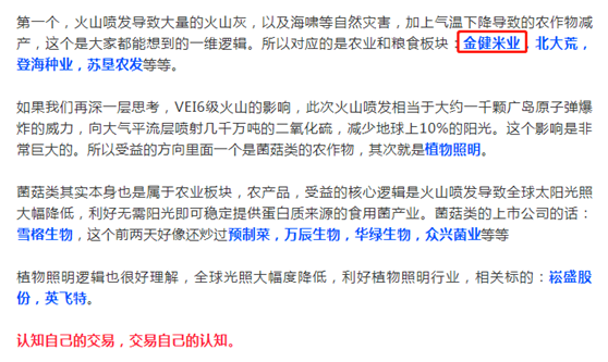 在這一舉動(dòng)的背后,還有游資精心布局,一部分A股標(biāo)的物被整理出來,貼上“火山利好”概念,概念炒作、操縱股價(jià)、高位派發(fā)的“擊鼓傳花”游戲已是蓄勢待發(fā)。主業(yè)是糧油深加工的金健米業(yè)也被自媒體標(biāo)上“火山利好”概念。