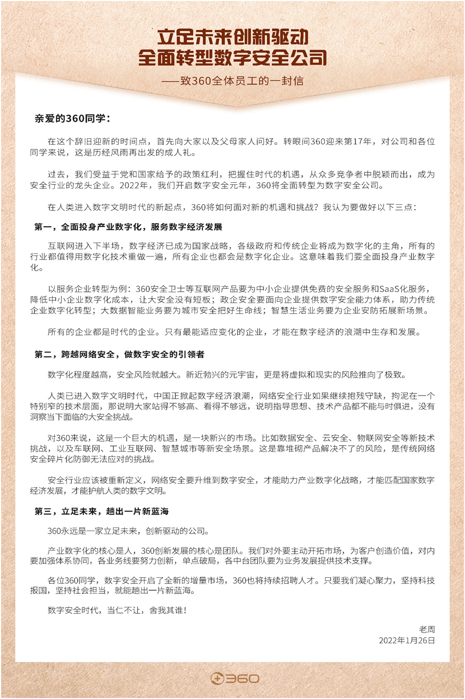 1月26日,360集團創(chuàng)始人周鴻祎發(fā)出內(nèi)部全員信,宣布360全面轉(zhuǎn)型數(shù)字安全公司。2022年數(shù)字安全元年到來,同時開啟了全新增量市場,周鴻祎稱360將持續(xù)招聘人才。