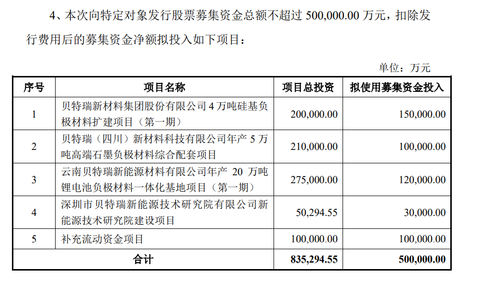 6月23日收盤后,北交所上市公司貝特瑞發(fā)布的2022年度向特定對(duì)象發(fā)行股票募集說明書(草案)顯示,擬定增募集資金總額不超過50億元,是北交所開市以來最大規(guī)模的再融資項(xiàng)目。