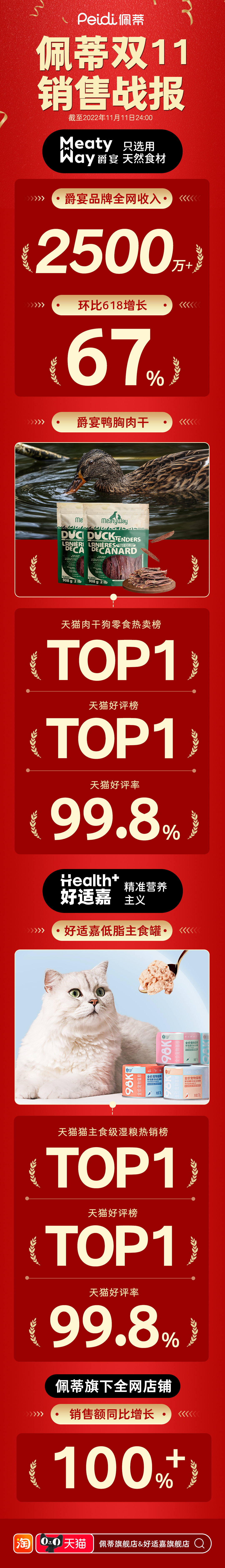 “雙11”期間,佩蒂股份旗下全網(wǎng)店鋪銷售額同比增長超100%。狗類產(chǎn)品中,爵宴鴨肉干登上了天貓肉干狗零食熱賣榜TOP1、天貓好評榜TOP1,好評率達99.8%;貓類產(chǎn)品好適嘉低脂主食罐表現(xiàn)同樣亮眼,登上了天貓貓主食級濕糧熱銷榜TOP1、天貓好評榜TOP1,好評率同樣高達99.8%,以實力贏得了寵物主的關注。