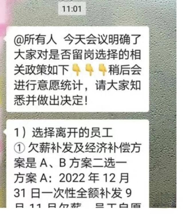 針對解決欠薪問題的進展,一位國美中層人士向《證券日報》記者透露,公司內(nèi)部通知,給出了三個選擇,對于選擇離開員工而言,其有A、B兩個方案可以選擇:一是選擇離開,2022年12月31日一次性全額補發(fā)9月份至11月份欠薪,員工自愿放棄本次經(jīng)濟補償;二是等待賠償,2023年3月31日,國美將補發(fā)欠薪并支付全數(shù)補償。對于繼續(xù)留職員工,員工需同意與新公司主體重新簽訂勞動合同,2022年12月31日一次性全額補發(fā)9月份至11月份欠薪,員工自愿放棄對本次經(jīng)濟補償金的追討,并自12月份起執(zhí)行新的薪酬績效方案。