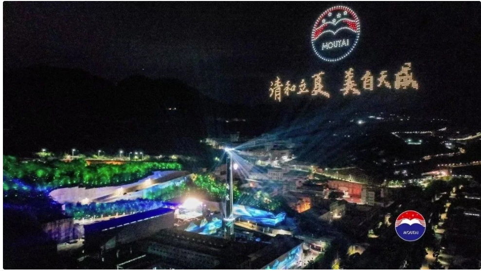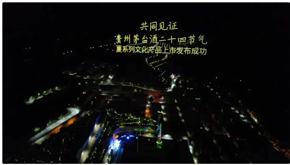 多架無人機以夜空為幕,在美輪美奐的燈光色彩配合下,小巽、茅臺酒瓶等造型和“共同見證貴州茅臺酒二十四節(jié)氣夏系列文化產(chǎn)品上市發(fā)布成功”等字樣依次呈現(xiàn),為與會人員獻上了一場精彩的視覺盛宴,更展示了茅臺品牌和文化的極致魅力。