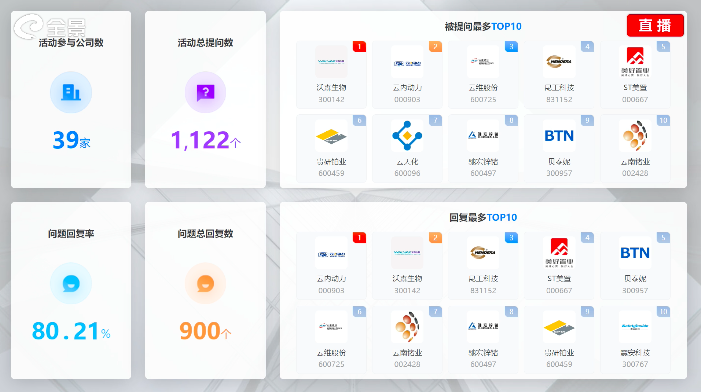 據(jù)線上數(shù)據(jù)統(tǒng)計(jì),截至5月11日上午12點(diǎn),投資者在本次活動共提問1122個(gè),上市公司問題總回復(fù)數(shù)量為900個(gè),問題回復(fù)率達(dá)到80.21%。其中,穩(wěn)定股價(jià)、提升盈利能力等市值管理相關(guān)問題成為投資者提問較多的領(lǐng)域。