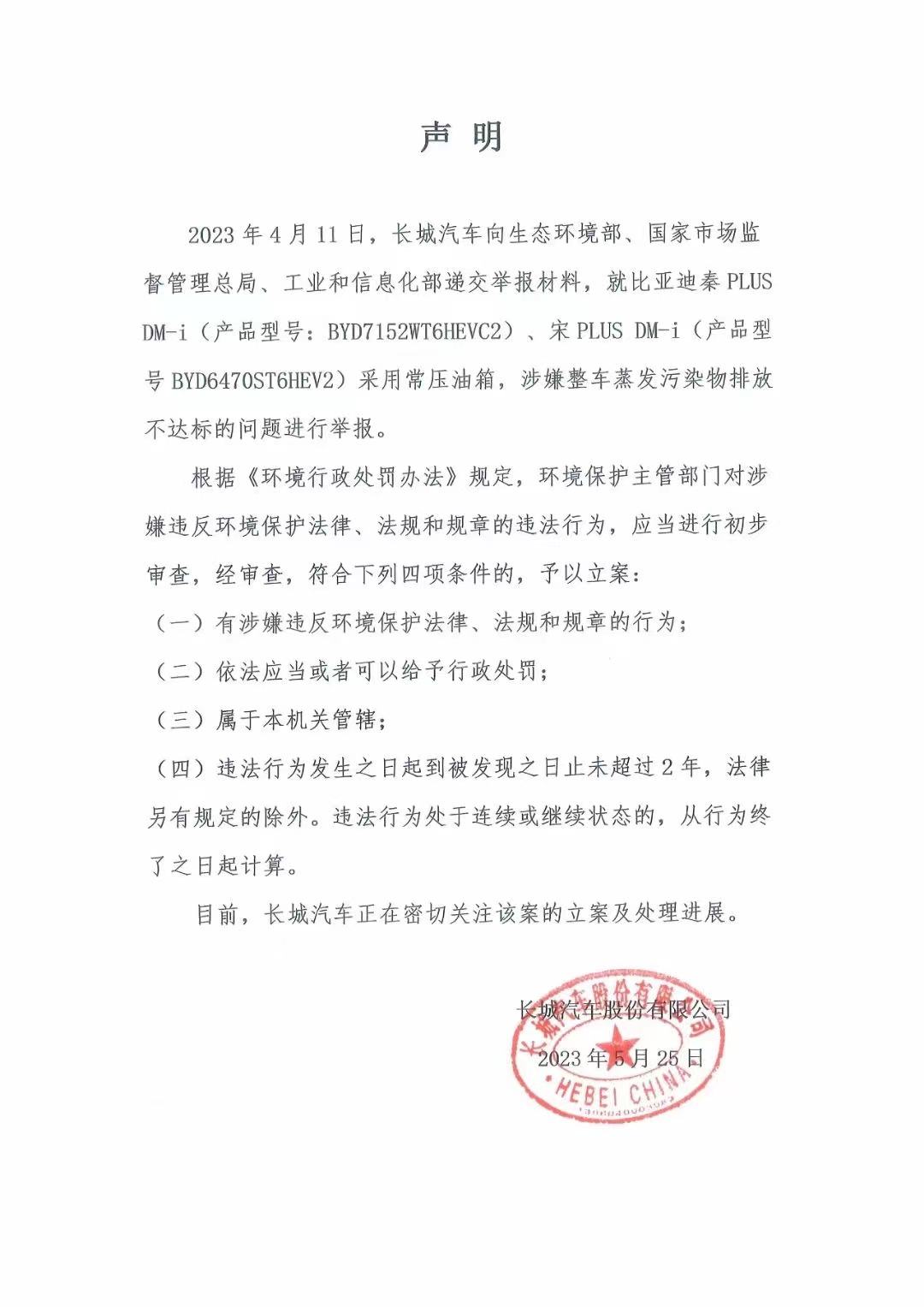 長城汽車今日發(fā)布聲明稱,4月11日,長城汽車向生態(tài)環(huán)境部、國家市場監(jiān)督管理總局、工業(yè)和信息化部遞交舉報材料,就比亞迪秦PLUSDM-i、宋PLUS DM-i采用常壓油箱,涉嫌整車蒸發(fā)污染物排放不達標(biāo)的問題進行舉報。