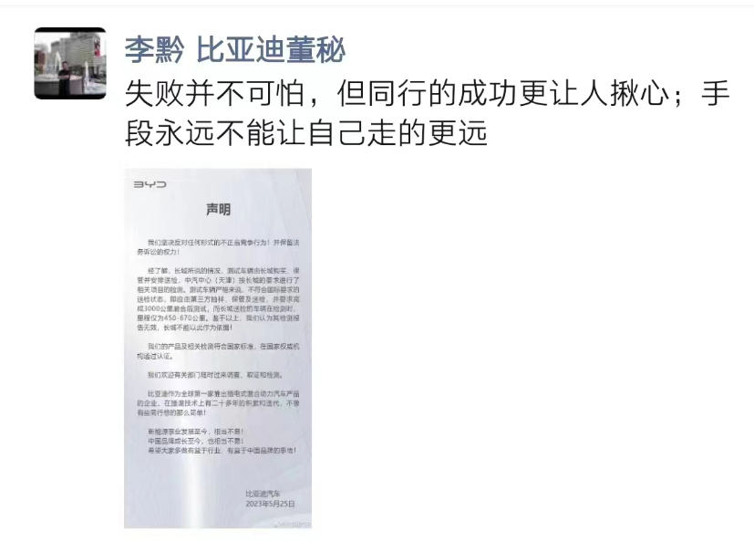 比亞迪董秘李黔也通過社交賬戶發(fā)文:“失敗并不可怕,但同行的成功更讓人揪心;手段永遠不能讓自己走的更遠。”