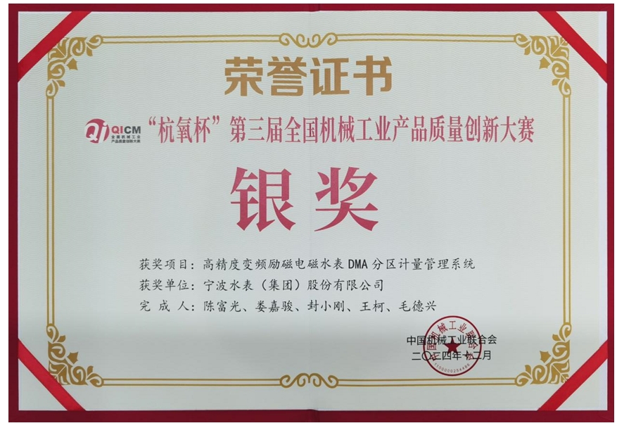 2024年12月11日,“杭氧杯”第三屆全國(guó)機(jī)械工業(yè)產(chǎn)品質(zhì)量創(chuàng)新大賽頒獎(jiǎng)大會(huì)在杭州召開(kāi)。在追求卓越品質(zhì)與創(chuàng)新突破的機(jī)械工業(yè)領(lǐng)域,寧水集團(tuán)(603700)憑借“高精度變頻勵(lì)磁電磁水表DMA分區(qū)計(jì)量管理系統(tǒng)”這一參賽產(chǎn)品,在“杭氧杯”中脫穎而出,榮獲銀獎(jiǎng)。