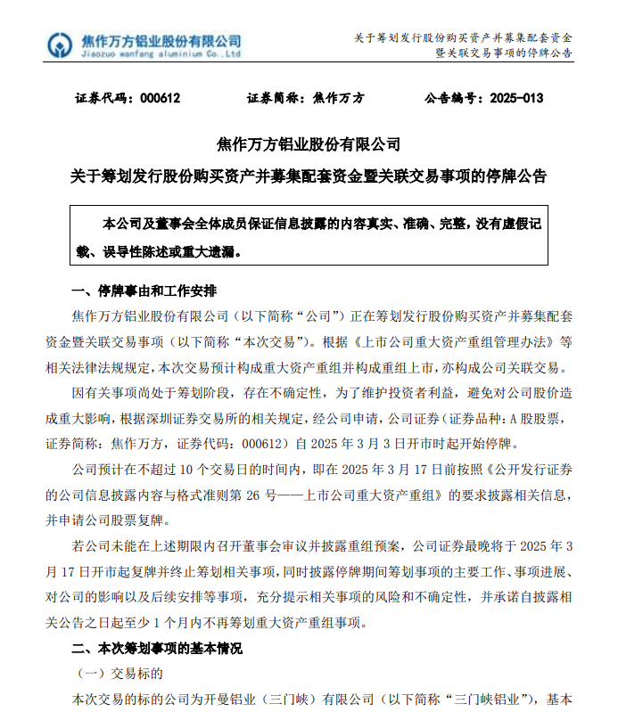 焦作萬(wàn)方股票自2025年3月3日開(kāi)市時(shí)起開(kāi)始停牌,預(yù)計(jì)停牌不超過(guò)10個(gè)交易日。