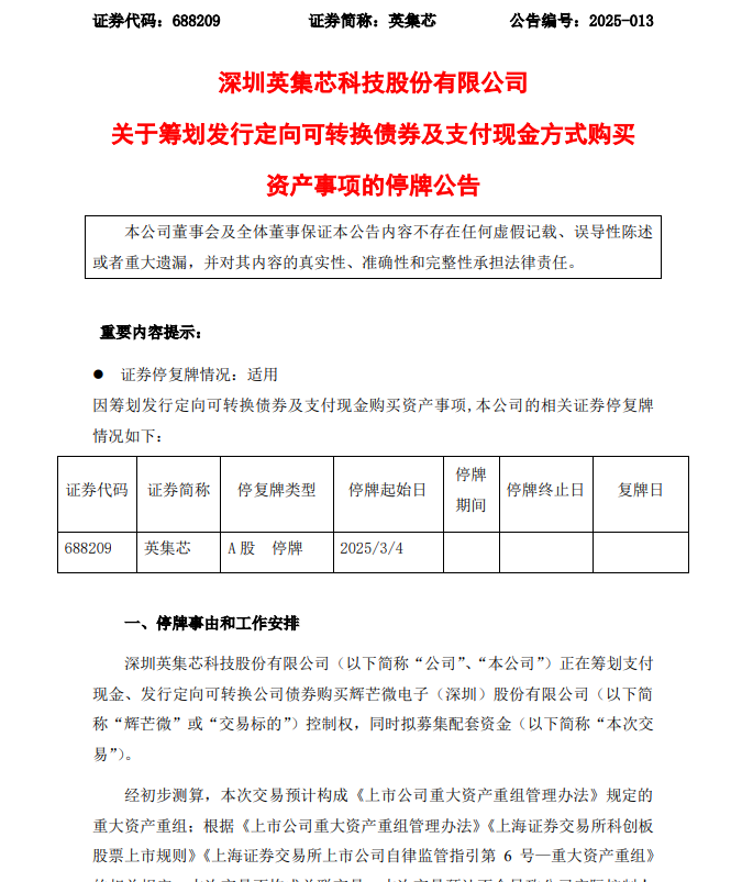英集芯股票自2025年3月4日起停牌,預(yù)計不超過5個交易日。