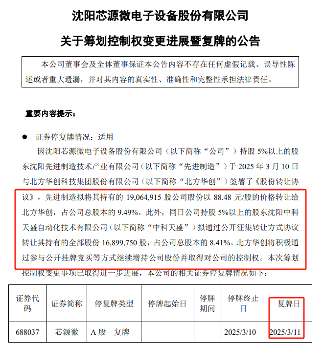 停牌三個(gè)交易日后,沈陽芯源微電子設(shè)備股份有限公司(以下簡(jiǎn)稱“芯源微”,股票代碼:688037)前期籌劃的控制權(quán)變更在3月10日晚間揭開蓋頭。公告顯示,公司現(xiàn)第二大股東沈陽先進(jìn)制造技術(shù)產(chǎn)業(yè)有限公司(以下簡(jiǎn)稱“先進(jìn)制造”)擬將其持有的芯源微全部股份轉(zhuǎn)讓給北方華創(chuàng)科技集團(tuán)股份有限公司(以下簡(jiǎn)稱“北方華創(chuàng)”),北方華創(chuàng)未來還將繼續(xù)增持芯源微股份并取得對(duì)其控制權(quán)。芯源微股票3月11日開市起復(fù)牌。