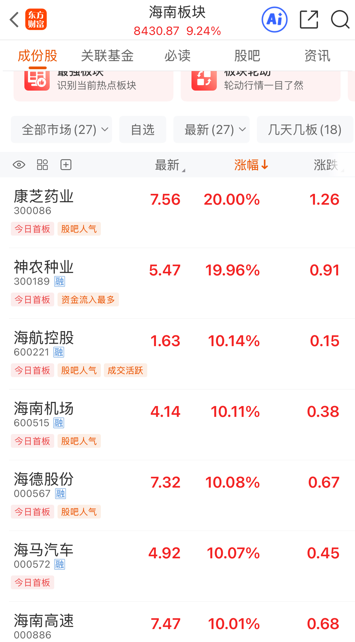 板塊中,海南相關(guān)概念板塊大漲,根據(jù)東方財(cái)富數(shù)據(jù),海南本地個(gè)股中超半數(shù)股票漲停,包括康芝藥業(yè)、海航控股、海南機(jī)場、海南礦業(yè)等16只個(gè)股,海南板塊整體漲幅超9%。