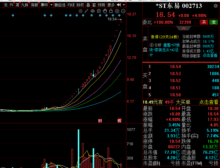 經(jīng)過三個(gè)交易日停牌核查后,11月19日,東易日盛家居裝飾集團(tuán)股份有限公司(證券簡(jiǎn)稱:*ST東易,證券代碼:002713)復(fù)牌后再度漲停,創(chuàng)下29個(gè)交易日內(nèi)24次漲停紀(jì)錄。截至午間收盤,公司股價(jià)從9月26日收盤價(jià)的5.17元/股漲至18.54元/股,漲幅達(dá)258.61%。