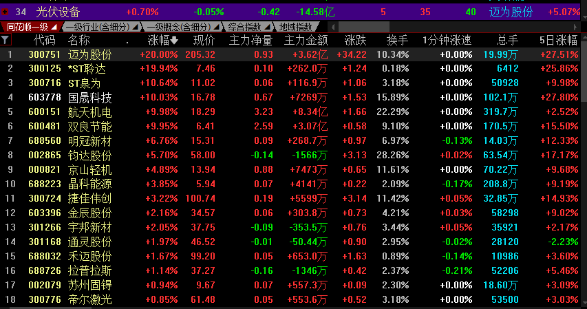 本報訊 (記者向炎濤)12月29日,同花順光伏設備概念板塊震蕩走強,其中異質結、鈣鈦礦電池方向領漲。截至當日收盤,邁為股份(300751)20%漲停、*ST聆達(300125)19.94%漲停,航天機電(600151)、雙良節(jié)能(600481)、國晟科技(603778)等個股“10cm”漲停。其中,國晟科技(603778)股價創(chuàng)新高,報收16.78元每股,總市值110.2億元。