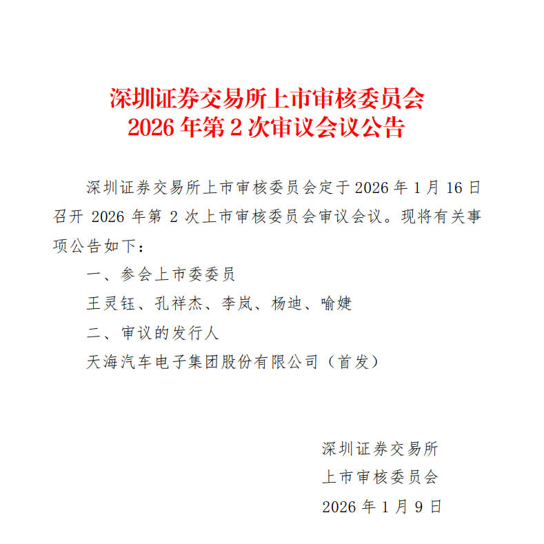 本報(bào)訊 (記者肖艷青)1月9日,深交所官網(wǎng)顯示,深交所上市審核委員會(huì)將于1月16日召開2026年第2次上市審核委員會(huì)審議會(huì)議,審議天海汽車電子集團(tuán)股份有限公司(以下簡(jiǎn)稱“天海電子”)深交所主板首發(fā)事項(xiàng)。