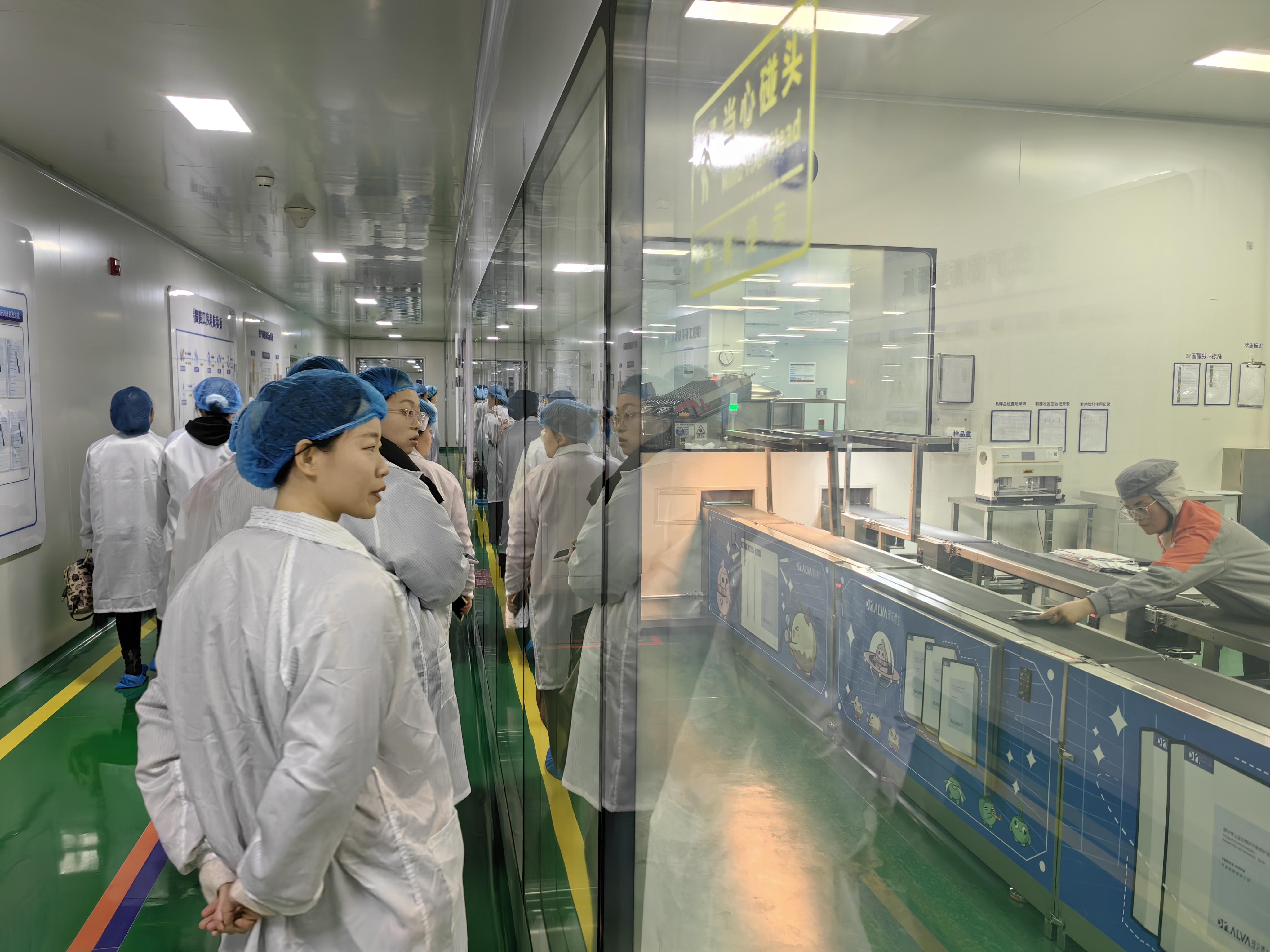 “平時用的玻尿酸精華液,原來是在這么潔凈又高科技的環(huán)境里生產(chǎn)的。”一位年輕媽媽帶著女兒駐足在生產(chǎn)線前,透過玻璃仔細觀察。