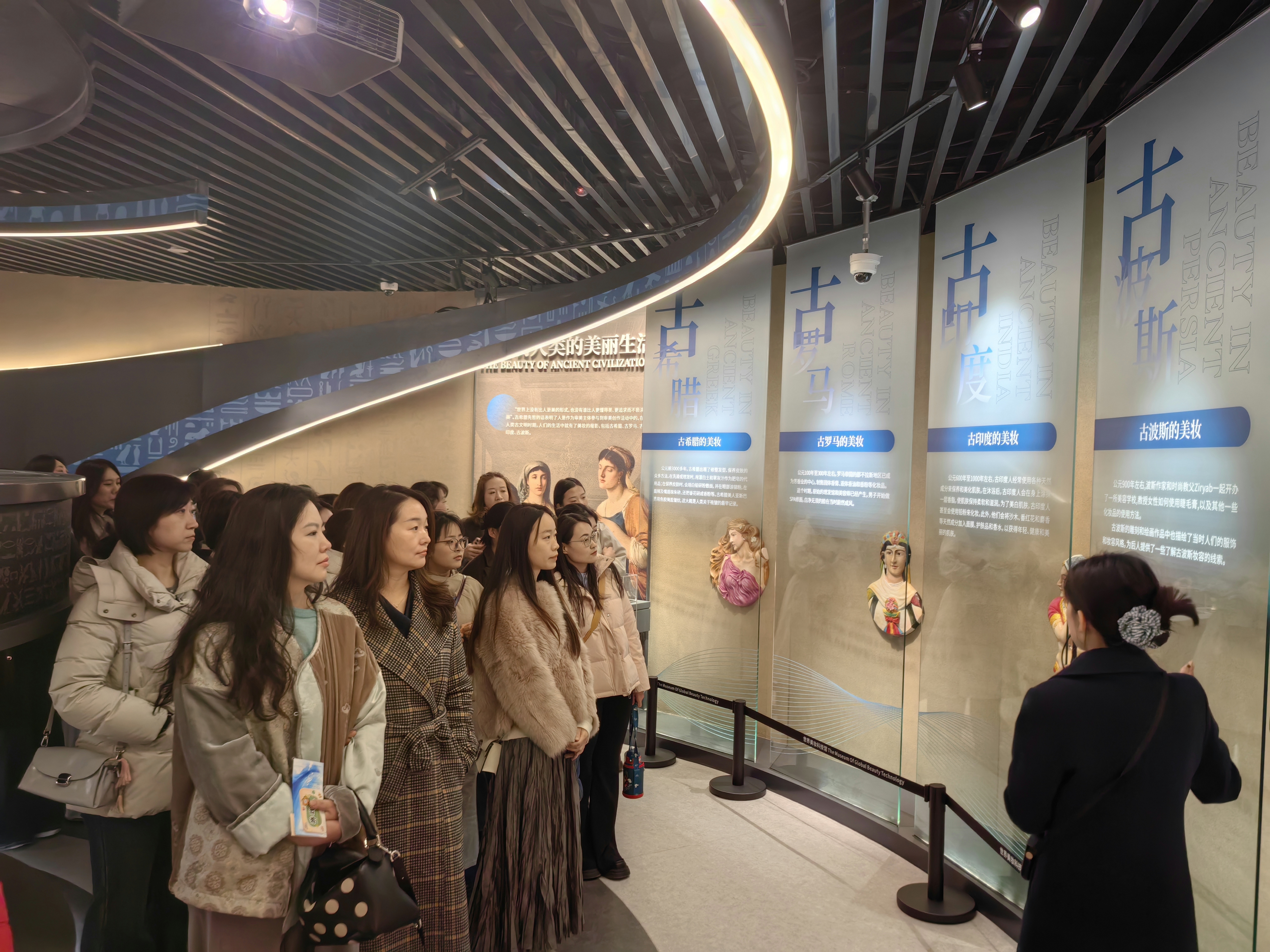 福瑞達智美科創(chuàng)園內(nèi)的世界美妝科技館中,講解員正帶領(lǐng)當(dāng)天來參與活動的游客穿越數(shù)千年美妝史。從尼羅河畔的化妝容器,到現(xiàn)代基因護膚的前沿探索,這座國內(nèi)首個美妝主題科技館用豐富的展品和互動裝置,勾勒出人類對美的執(zhí)著追求。在“皮膚的秘密”互動區(qū),幾位女士通過肌理檢測儀了解自己的膚質(zhì),在AI變妝裝置前互動拍照。