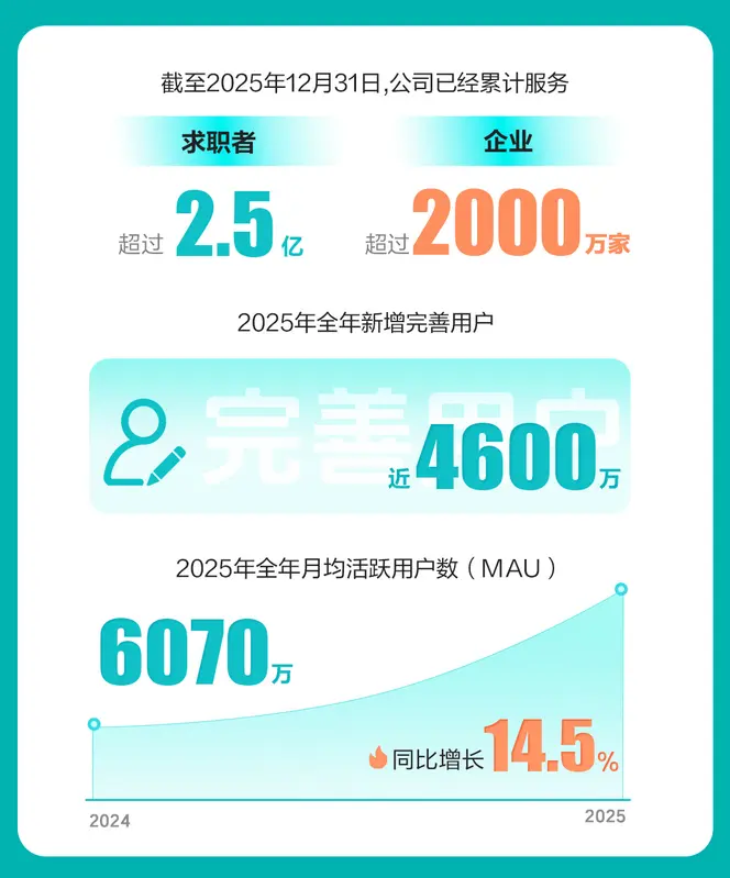 截至2025年12月31日止的十二個(gè)月內(nèi),公司付費(fèi)企業(yè)客戶數(shù)達(dá)680萬(wàn),同比上漲11.5%。截至2025年12月31日,公司累計(jì)服務(wù)超過(guò)2.5億求職者,服務(wù)企業(yè)總數(shù)超過(guò)2000萬(wàn)家。