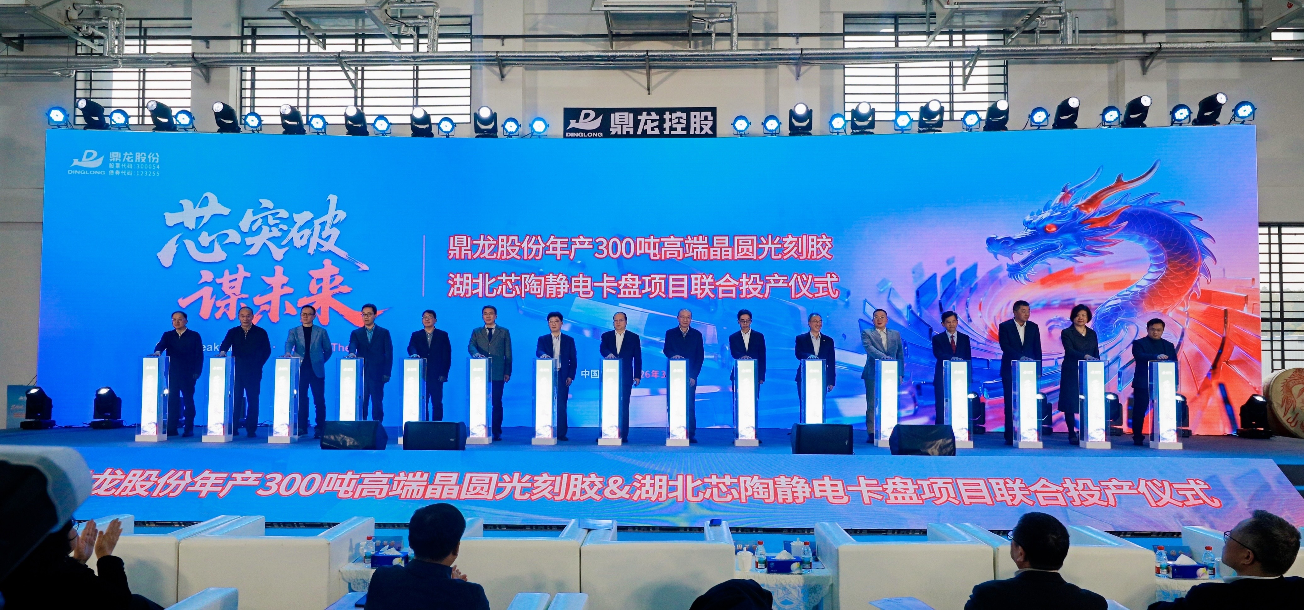 本報訊 (記者李萬晨曦)3月20日,湖北鼎龍控股股份有限公司(以下簡稱“鼎龍股份”)在武漢總部舉行“芯突破·謀未來——鼎龍股份年產(chǎn)300噸高端晶圓光刻膠&湖北芯陶靜電卡盤項目聯(lián)合投產(chǎn)儀式”。隨著啟動按鈕按下,鼎龍股份年產(chǎn)300噸高端晶圓光刻膠項目,以及與鼎龍股份屬同一實際控制人背景的友鄰企業(yè)——湖北芯陶科技有限公司(以下簡稱“湖北芯陶”)先進制程靜電卡盤項目同步宣告投產(chǎn)。