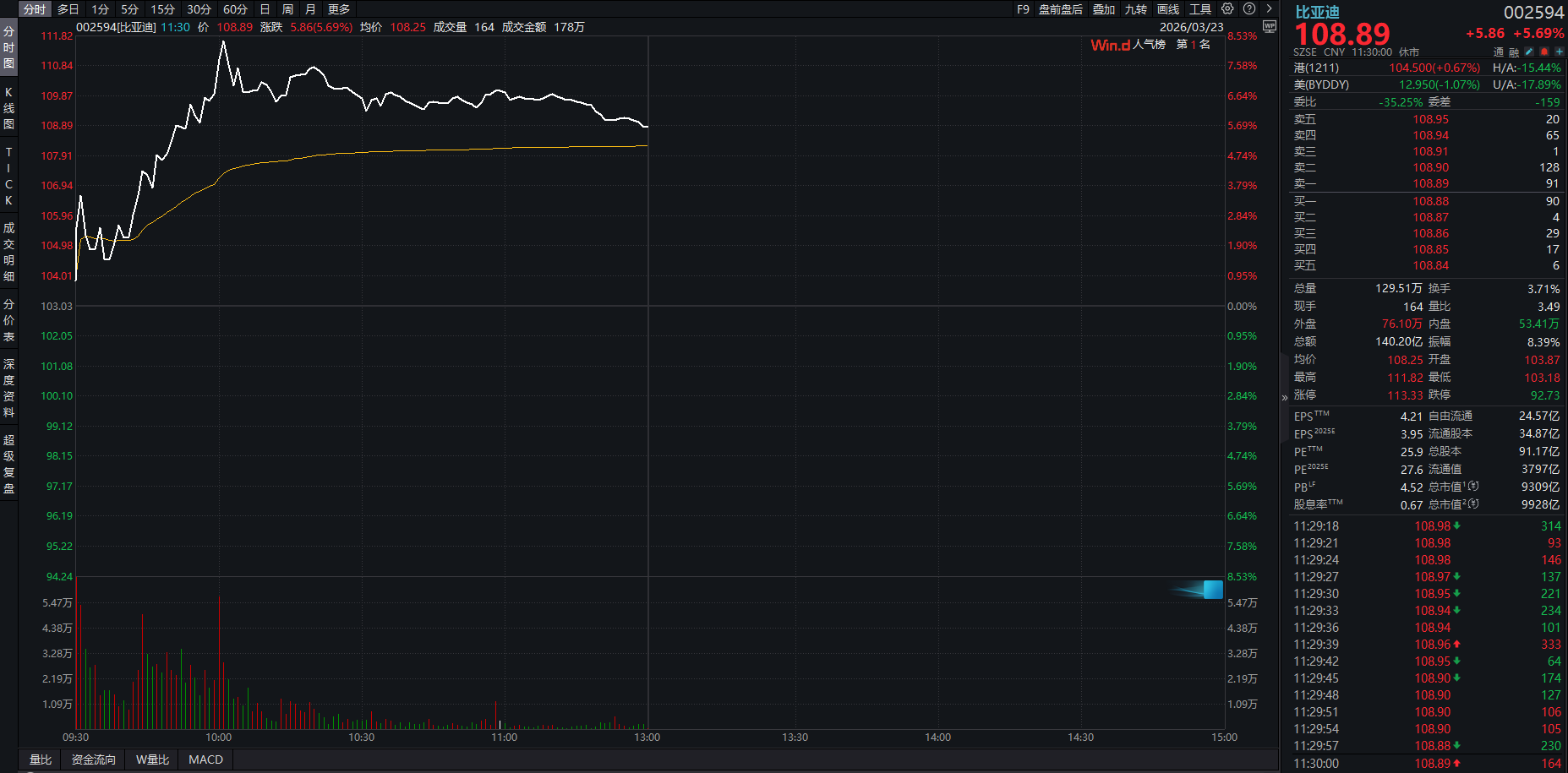 3月23日,比亞迪(002594.SZ)開盤強勢上漲,一度漲超8%,以A股股價計算的總市值一度重回萬億元上方,截至午間收盤報價108.89元/股,漲幅為5.69%,日內(nèi)成交額超過140億元。