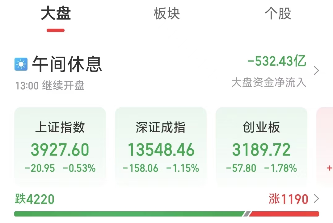 周四(4月2日),三大股指震蕩整理,板塊輪動(dòng)加速。截至上午收盤(pán),上證指數(shù)跌幅為0.53%,報(bào)3927.6點(diǎn);深證成指和創(chuàng)業(yè)板指跌幅分別為1.15%和1.78%;滬深兩市合計(jì)成交額11867.04億元,總體來(lái)看,兩市個(gè)股跌多漲少,共有1190只個(gè)股實(shí)現(xiàn)上漲。
