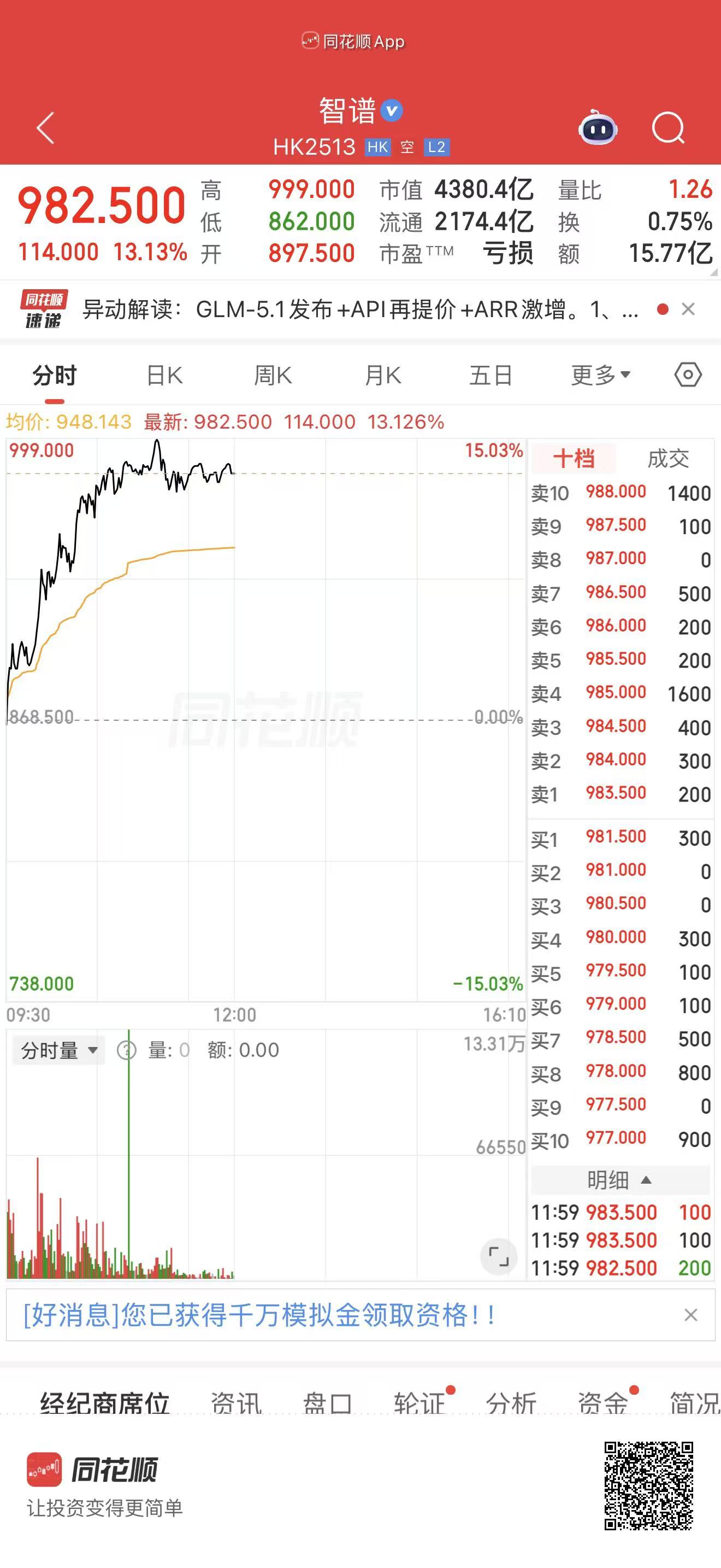 本報訊 (記者梁傲男)4月9日早盤,北京智譜華章科技股份有限公司(以下簡稱“智譜”,股票代碼“HK2513”)開盤快速拉升,盤中最高漲超15%,股價觸及每股999港元,續(xù)刷新高。