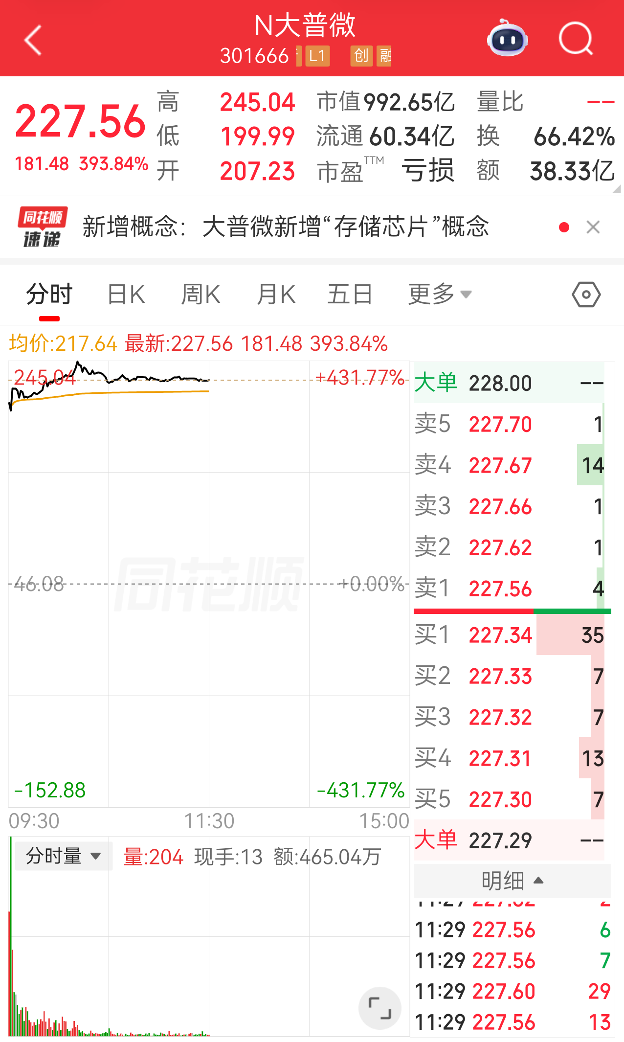 上市首日,大普微股價(jià)開于207.23元/股,一度漲超430%,截至中午收盤,公司股價(jià)報(bào)227.56元/股,漲幅為393.84%,接近400%,換手率超過66%。