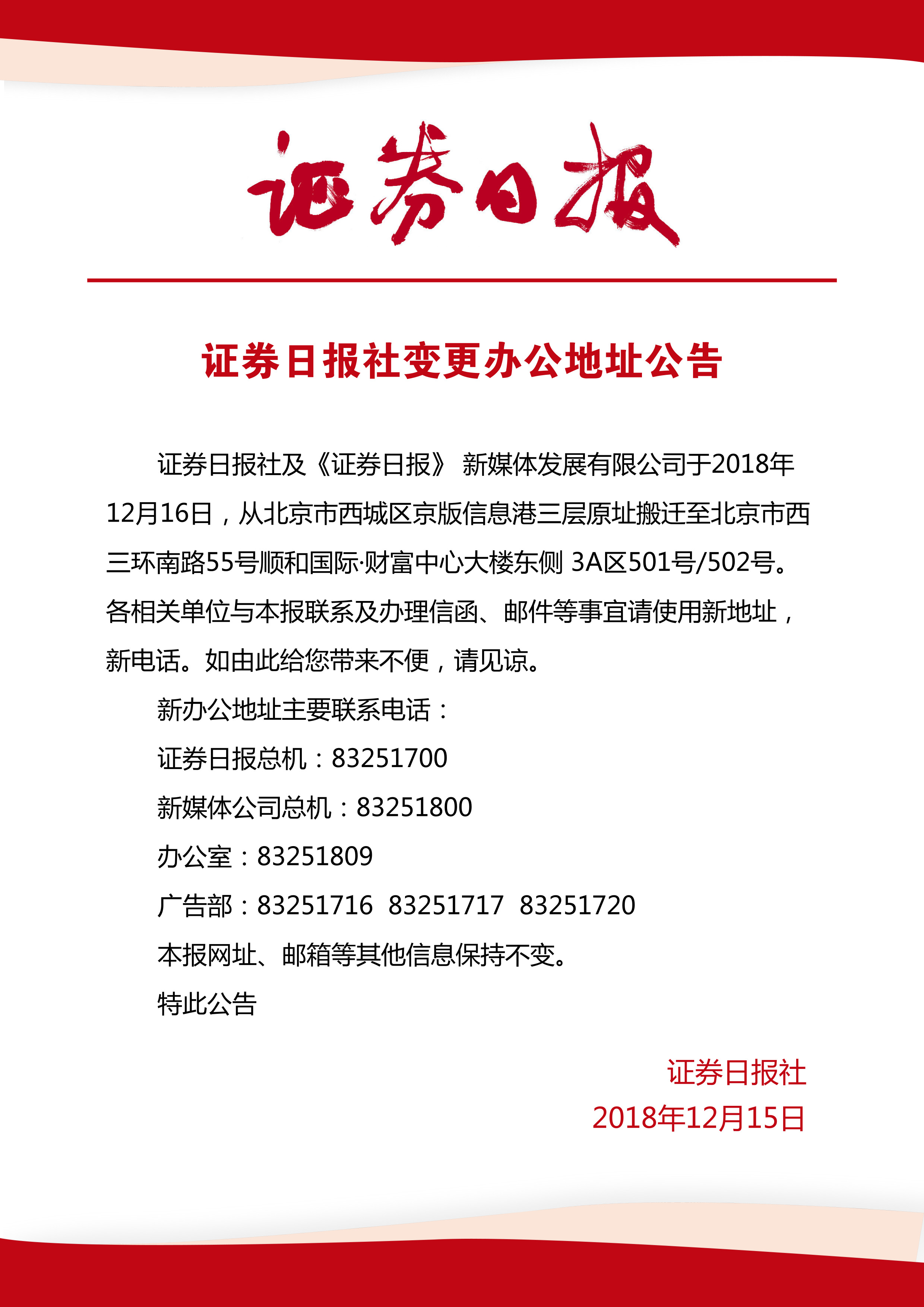 證券日報社及《證券日報》新媒體發(fā)展有限公司于2018年12月16日,從北京市西城區(qū)京版信息港三層原址搬遷至北京市西三環(huán)南路55號順和國際·財富中心大樓東側(cè)3A區(qū)501號/502號。各相關(guān)單位與本報聯(lián)系及辦理信函、郵件等事宜請使用新地址,新電話。如由此給您帶來不便,請見諒。