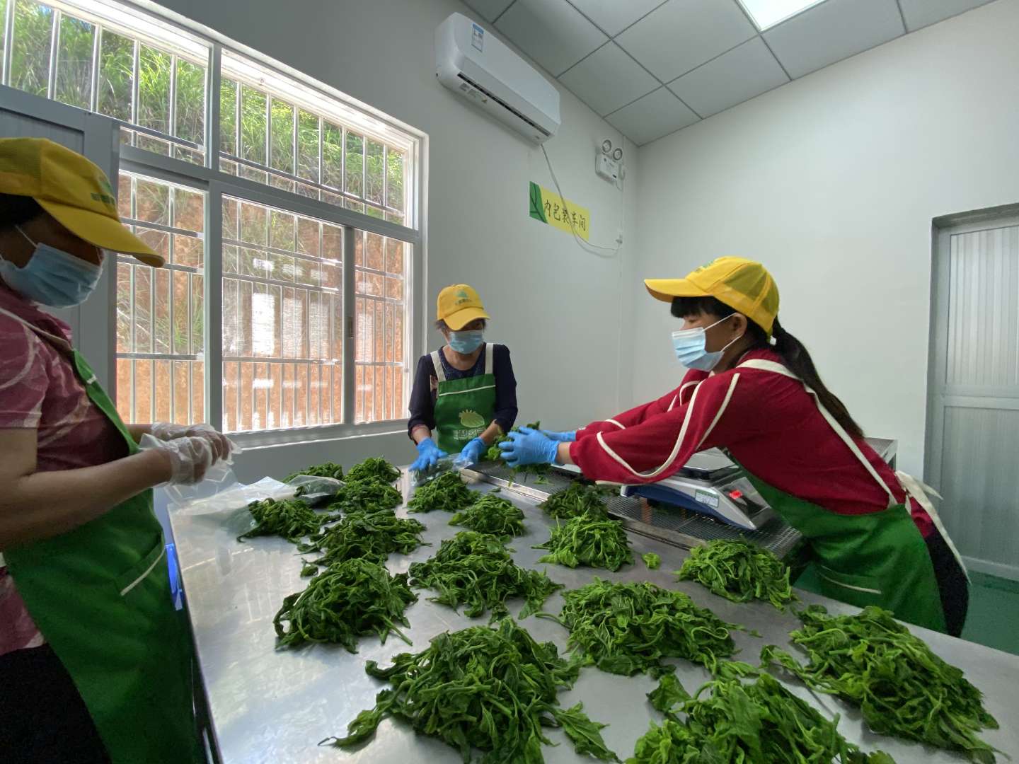 (桑芽菜種植合作社工人們?cè)谲囬g進(jìn)行分揀包裝)
