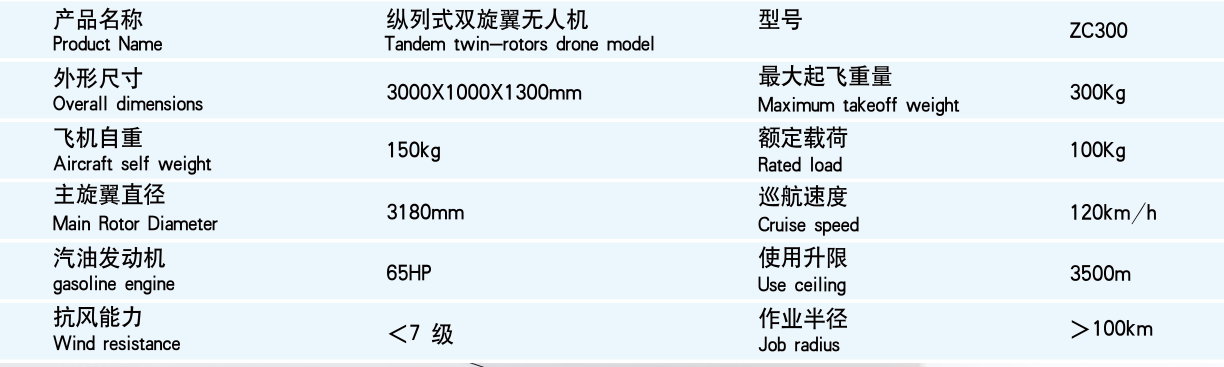 而中創(chuàng)航空的ZC300產品,則采用緊湊3000×1000×1300mm的機體結構,抗風能力強,最大起飛重量300Kg,飛機自重150kg,額定任務載荷100Kg。