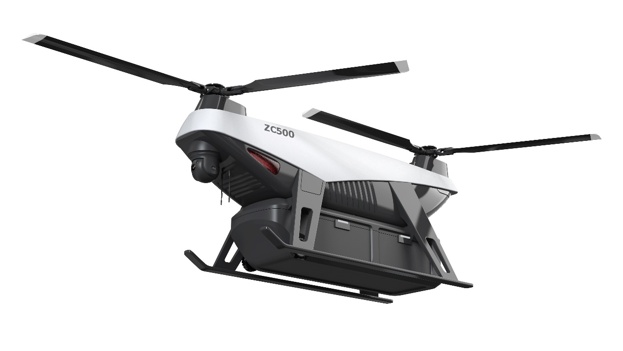 其中,ZC500型縱列式雙旋翼無人機,是公司歷時7年研發(fā)、測試,推出的一款多用途無人直升機??v列雙旋翼構型的主要優(yōu)點是縱向重心范圍大,因此機身掛載空間大,尤其在物資投送方面具有顯著優(yōu)勢。相比其他構型的直升機來說,通常對于貨物掛載有嚴格要求,更換負荷或者調整掛載位置后需要重新配平重心。重心偏差對于常規(guī)構型直升機來說是非常危險的因素,這給用戶使用帶來非常大的困擾。