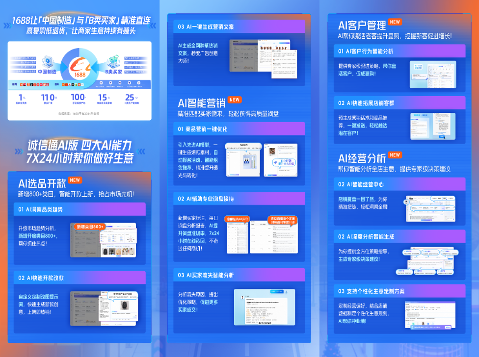 據(jù)悉,誠信通AI版通過AI選品開款、AI智能營銷、AI客戶管理、AI經(jīng)營分析四大核心能力,7x24小時助力生意全流程,幫助商家從傳統(tǒng)經(jīng)營向智能經(jīng)營模式升級,降低中小企業(yè)生意門檻,讓每個中小企業(yè)擁有自己的生意Agent,讓每一個源頭廠商的生意更簡單。