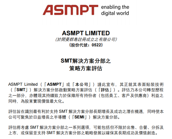 本報訊 (記者賈麗)全球半導體封裝設備龍頭ASMPT于近日發(fā)布公告宣布,公司正評估旗下表面貼裝技術業(yè)務(SMT)選項,有可能涉及出售、合營、分拆或上市。