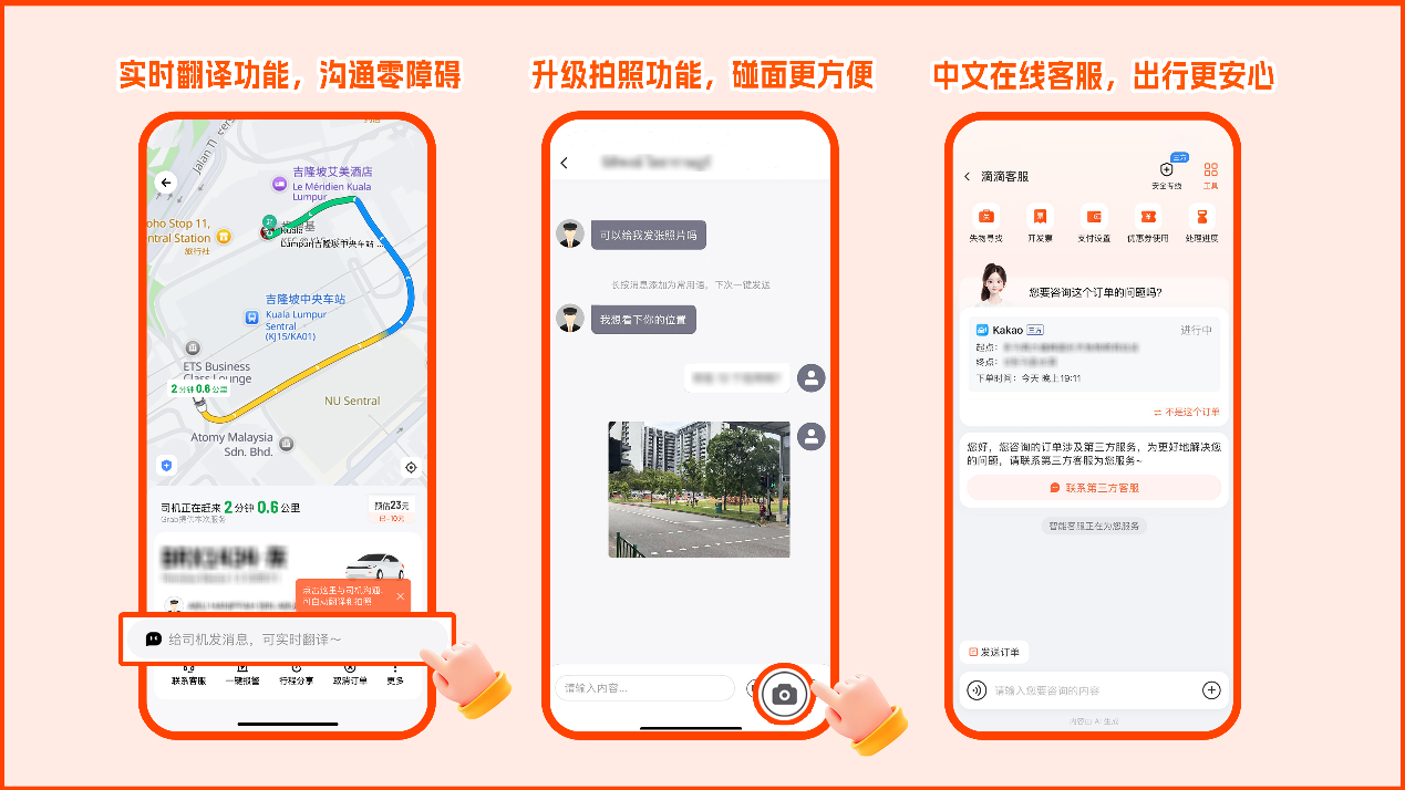 滴滴海外出行作為用戶在海外旅途中貼心的同行者,中文界面,支持中/英文輸入起終點(diǎn),下單輕松又方便。滴滴App內(nèi)還有實(shí)時(shí)翻譯功能,讓您在App上與海外司機(jī)溝通零障礙,無論是詢問路線還是分享旅途趣事,都能暢所欲言,部分城市還試行通過App內(nèi)消息給司機(jī)發(fā)照片功能,司機(jī)接你更方便。更有7×24小時(shí)中文在線客服,隨時(shí)為您解決行程中的疑問,讓您在國(guó)外也能感受到家的溫暖。