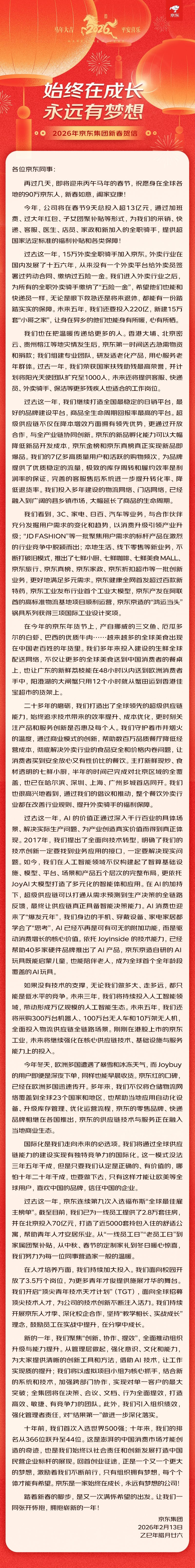 本報訊 (記者梁傲男)2月13日,京東集團面向全球90萬京東人發(fā)布新春賀信,今年的新春賀信以《始終在成長,永遠(yuǎn)有夢想》為主題,全文如下: