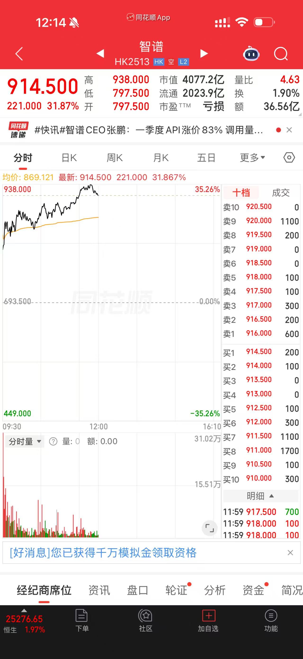 4月1日早盤,北京智譜華章科技股份有限公司(以下簡(jiǎn)稱“智譜”,股票代碼“HK2513”)股價(jià)大漲。盤中最高漲超35%,觸及每股938港元,續(xù)刷歷史新高。截至上午收盤,智譜股價(jià)為每股914.5港元,上漲31.87%,總市值達(dá)4077.2億港元。