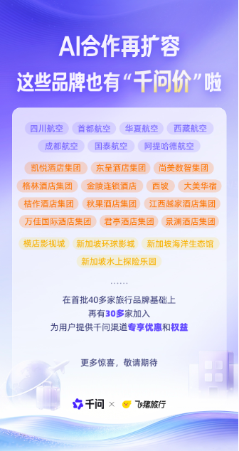 與千問(wèn)和飛豬達(dá)成AI合作的旅行品牌迅速擴(kuò)充。一個(gè)多月前,千問(wèn)和飛豬宣布與包括中國(guó)東方航空、中國(guó)南方航空、萬(wàn)達(dá)酒店及度假村、上海迪士尼度假區(qū)等在內(nèi)的40多個(gè)旅行品牌達(dá)成AI合作。兩波累計(jì)超80家合作品牌將為千問(wèn)用戶提供包括折扣價(jià)、立減券、酒店早餐及延遲退房等在內(nèi)的優(yōu)惠或權(quán)益,單件商品最高立減300元。
