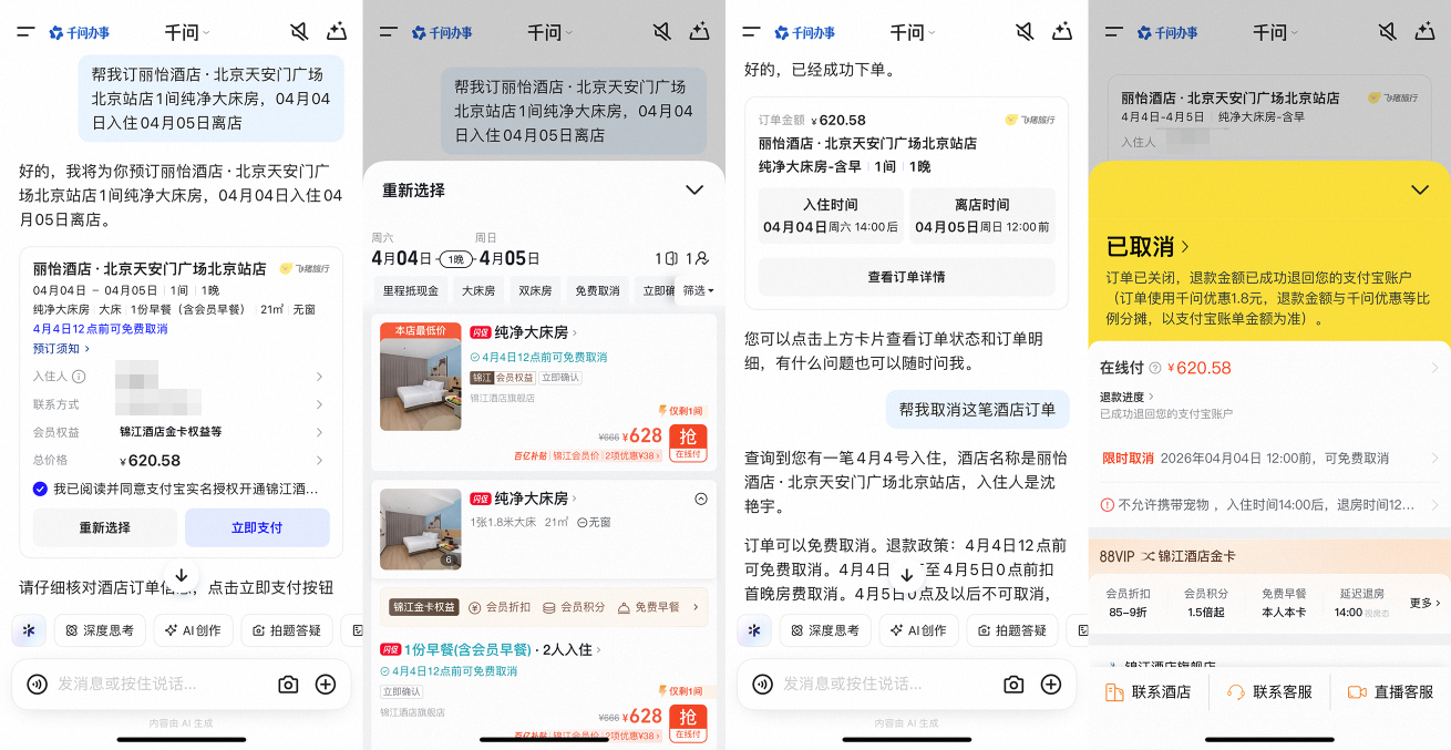 千問(wèn)APP深度接入飛豬,AI訂旅行的體驗(yàn)日益提升,用戶的旅行探索、預(yù)訂和售后服務(wù)更加豐富和專業(yè)。目前,一批新功能正在逐步開(kāi)放測(cè)試體驗(yàn),用戶可以通過(guò)對(duì)話在千問(wèn)APP內(nèi)便捷選擇酒店房型、一鍵付款,還能讓千問(wèn)修改已經(jīng)生成的訂單、幫忙退訂、查詢退款進(jìn)度等。