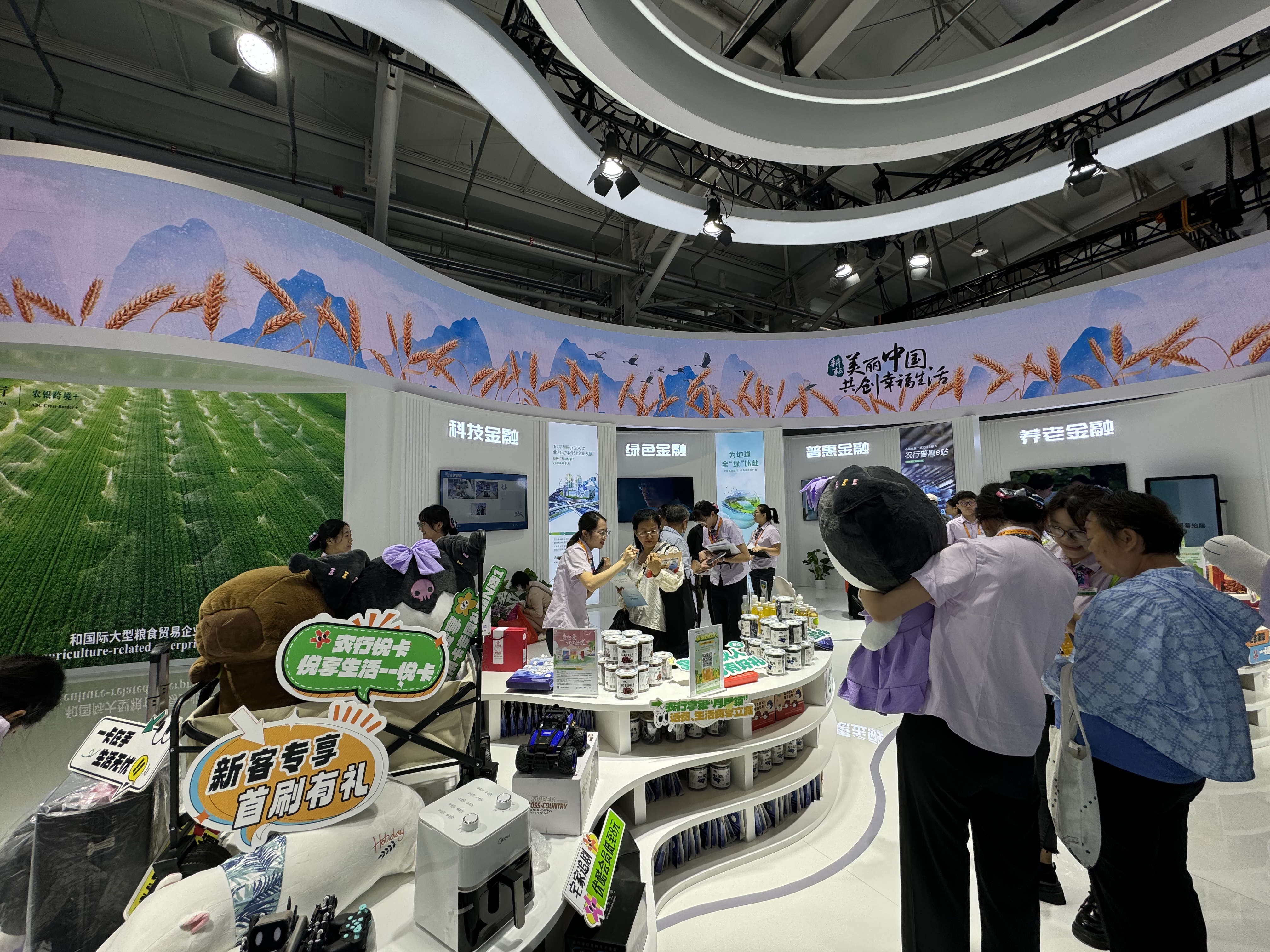 進(jìn)入農(nóng)業(yè)銀行主展區(qū),猶如走進(jìn)一幅巨大的山河畫卷。景觀式梯田將觀眾帶入一個(gè)充滿包裹感與層次感的峽谷狀空間,展臺(tái)中部360度球型屏幕如同緩緩升起的熱氣球,鄉(xiāng)村振興、“五篇大文章”、京津冀協(xié)同發(fā)展十周年等三大板塊依次展開?,F(xiàn)場聚集了不少參觀者,工作人員也積極向他們科普金融知識(shí),辦理相關(guān)業(yè)務(wù)。