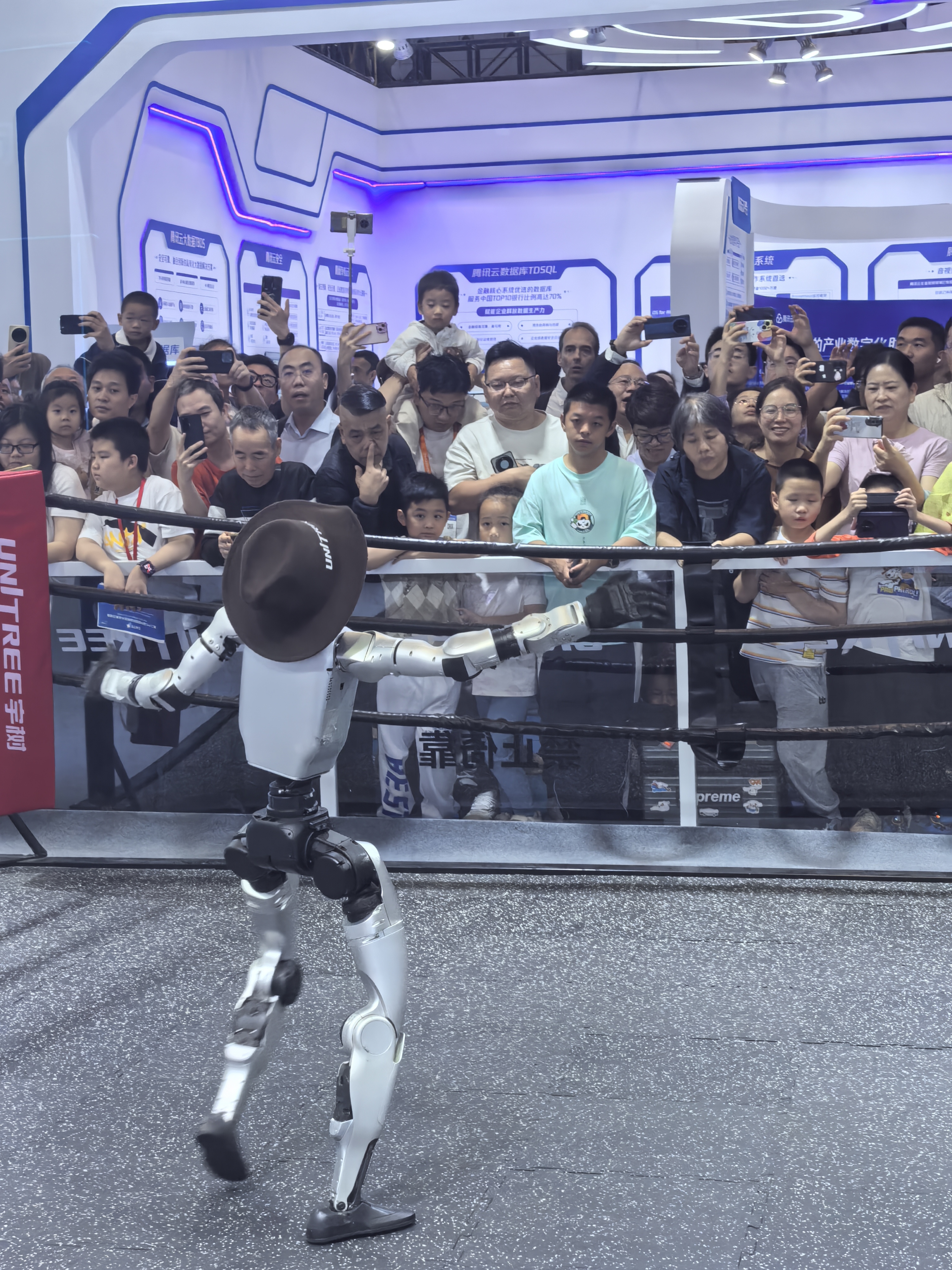 即使開展最后一天,機器人展區(qū)仍舊人頭攢動,熱度絲毫不減。在宇樹科技股份有限公司(以下簡稱“宇樹”)展區(qū),機器人格斗比賽開賽前半小時,游客已將展位圍得水泄不通。小朋友則聚集在上海傅利葉智能科技股份有限公司(以下簡稱“傅利葉”)展區(qū),與機器人比拼“井字棋”,一旁深圳市眾擎機器人科技有限公司等企業(yè)的“機器人軍團”巡游,展現(xiàn)出穩(wěn)健的運動和應變能力。